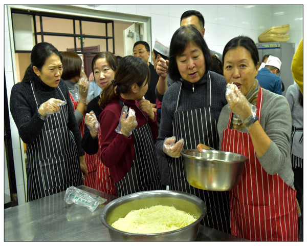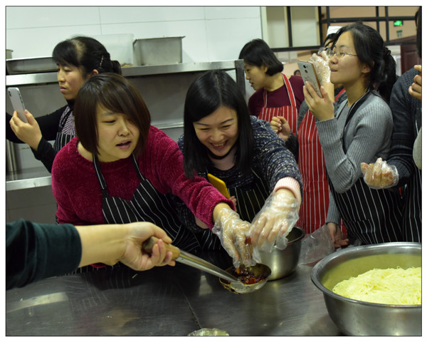 培训分为三个环节,第一个环节为孙厨师讲解教授红烧肉、锅包肉、炝拌土豆丝的做法;第二环节为学员现场操作;第三个是品尝环节。本次活动恰逢冬至节气,校妇委会、工会、后勤保障处为所有学员带来节日的问候和祝福,并将所学菜式与传统节日冬至紧密结合,所有学员在一片欢声笑语中结束培训。