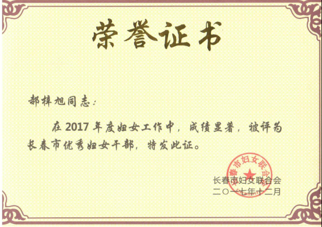 近日,长春巿妇女联合会下发了《关于2017年度全市先进妇女组织、优秀妇女干部的表彰决定》文件,我校妇委会被授予2017年度长春巿“先进妇委会”,管理学院妇委会主任郝梓旭同志被授予 2017年度长春市“优秀妇女干部”荣誉称号。