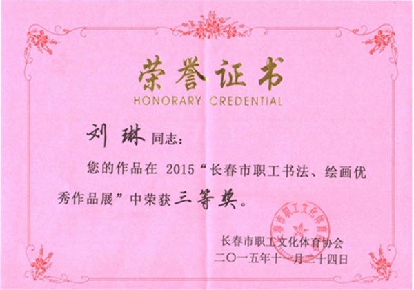 11月24日上午,长春市文体协会主办的2015年长春市职工优秀书法绘画作品展及颁奖仪式在市工人文化宫三楼展厅举行。我校组织职工参加活动,选送书法绘画共三幅作品,人文管理学院刘琳老师获得绘画类作品三等奖。