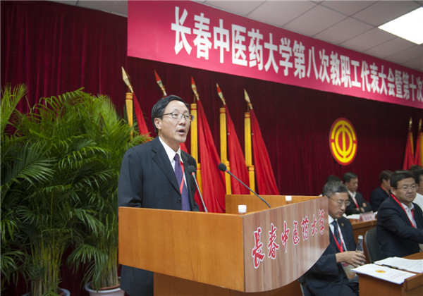 长春市总工会常务副主席朱琪在开幕式上作重要讲话,代表长春市总工会对大会的召开表示热烈祝贺。他在讲话中指出,近年来,在国家实施创新驱动,高等教育革故鼎新的时代大潮中,长春中医药大学抢抓机遇,锐意进取,办学成效显著,特别是学校第二次党代会,进一步坚定了建设一流中医药大学的发展目标,各项事业保持了良好的发展势头。多年来,63365.com、教代会在学校党委的正确领导和行政的大力支持下,紧密围绕学校的中心工作,全面履行工会组织基本职责,有效维护教职工的合法权益,组织开展丰富多彩、寓教于乐的文体活动,扎实推进学校民主政治建设,不断提升工会工作整体水平,在促进学校发展改革稳定的大局中,发挥了不可替代的作用。在谈到今后的工作时,朱主席强调站在时代的高度,准确把握新时期工会工作的政治方向;团结动员教职工立足岗位建功立业,为加快建设一流教学研究型中医药大学积极贡献智慧和力量;切实履行工会维护教职工合法权益的基本职责,组织引导教职工在为实现学校发展目标的奋斗中创造更美好的生活;要以改革创新精神,加强工会自身建设,不断提升学校工会工作的凝聚力和影响力。
